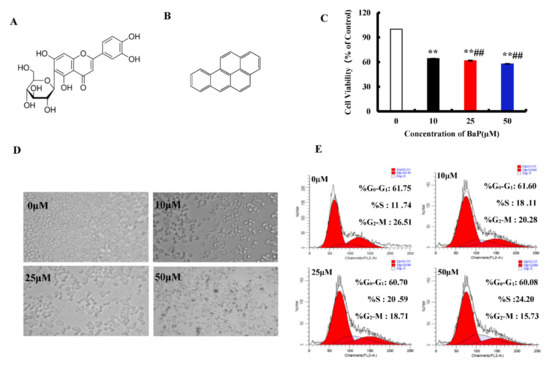 Effects of BaP on the proliferation of HL-7702 cells. Chemical structure of Iso (A) and BaP (B). Cells were incubated with BaP at different concentrations for 24 h and then processed for MTT assay. ** p < 0.01 compared with control, ## p < 0.01 compared with 10 µM BaP (C). Effect of BaP on cell morphology, which was observed with an optic microscope (D). Representative histograms of DNA content and cell cycle phases (G0-G1, S and G2-M) in BaP treated cells (E).