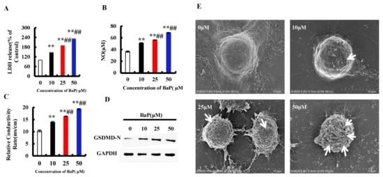 Pyroptosis is a form of the programmed cell death which accompanies inflammation. When pyroptosis occurs, the GSDMD-N is activated to oligomerize on the cell membrane and form pores, which leads to the change of cell membrane permeability. As shown in Figure 2E, there were few pores in the control group, and the number of pores increased with the increase of the concentration of BaP. Furthermore, compared with 0 µM BaP treatment, 50 µM BaP notably (p < 0.01) raised the overflow of LDH (Figure 2A) and NO (Figure 2B), and the electrical conductivity (Figure 2C) by 57.21%, 88.86%, and 87.17%, respectively, and resulted in the significant increasing trend in the protein expression of GSDMD-N (Figure 2D). These results indicated that BaP could induce the pyroptotic hepatocyte damage in HL-7702 cells.