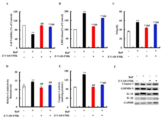 The classic pathway of pyroptosis is dominated by Caspase-1. Z-VAD-FMK is an irreversible Pan-Caspase inhibitor that can inhibit the activity of the Caspase family. We chose Z-VAD-FMK to verify whether or not the classic pathway of pyroptosis has been induced by BaP in HL-7702 cells. As shown in Figure 3A, in comparison with the control group, 25 µM BaP obviously (p < 0.01) decreased the cell viability by 39.40%, while the viability of cells which were exposed by Z-VAD-FMK and BaP only decreased by 7.3%, comparing with the control group. The same trends were found in the overflow of LDH (Figure 3B), NO (Figure 3C), and the electrical conductivity (Figure 3D). Similarly, Z-VAD-FMK weakened the enhancing effects of BaP on the Caspase-1 enzyme activity (Figure 3E), the protein expressions of Caspase-1, GSDMD-N, and inflammatory factors (IL-18, IL-1β) (Figure 3F), showing that BaP induced Caspase-1-dependent pyroptotic hepatocyte damage in HL-7702 liver cells.