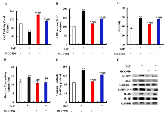 We assessed whether or not the activation of NLRP3 inflammasome is related to the occurrence of pyroptosis. MCC950 is an effective and selective inhibitor of NLRP3. It was obvious from Figure 4A that the addition of MCC950 could greatly (p < 0.01) reduce the degree of cell damage and improve cell viability. In the co-treatment with MCC950 and BaP group, LDH release (Figure 4B), NO (Figure 4C), and the electrical conductivity (Figure 4D) were significantly (p < 0.01) lower than in the BaP group. Moreover, the characteristic protein expressions of pyroptosis (Figure 4F) were also reduced by MCC950, as well as the Caspase-1 enzyme activity (Figure 4E), contrary to the result of the BaP group. These results fully proved that BaP induced the pyroptotic hepatocyte damage through activating NLRP3 inflammasome in HL-7702 liver cells.