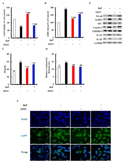 Inhibition of NF-κΒ can effectively reduce the level of pro-inflammatory cytokines. PDTC is an inhibitor of NF-κB activation that can inhibit the nuclear localization of NF-κB in cells. To explore whether or not BaP induced Caspase-1-dependent pyroptosis through activating NF-κB, then stimulating NLRP3 inflammasome, cells were exposed to PDTC. As shown in Figure 5A, PDTC could significantly (p < 0.01) alleviate the decline of cell viability caused by BaP. In comparison with the BaP treatment, 50 µM PDTC would significantly (p < 0.01) weaken the increase of LDH release (Figure 5B), NO (Figure 5C), and the electrical conductivity (Figure 5D) caused by BaP. The protein expressions of NF-κΒ, NLRP3, ASC, Caspase-1, GSDMD-N, IL-18, and IL-1β in the BaP and PDTC co-treatment group were also lower than those of the BaP group (Figure 5E). Meanwhile, BaP resulted in an obvious nuclear localization of NF-κB (p65), while PDTC could suppress the nuclear localization of NF-κΒ (p65) (Figure 5F). From the above, these results indicated that BaP induced Caspase-1-dependent pyroptosis through activating NF-κΒ, and then stimulating NLRP3.