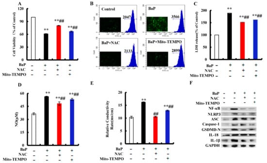 Effects of ROS inhibitor (NAC, 2 mM) and mtROS inhibitor (Mito-TEMPO, 50 µM) on BaP-induced pyroptotic hepatocyte damage. Cell viability (A), LDH (C), NO (D), and electrical conductivity (E) were detected. ** p < 0.01 compared with control, ## p < 0.01 compared with 25 µM BaP. ROS were examined by Flow cytometer and Fluorescence microscope (B). Western blot image of protein expression acquired by Chemical XRS Imaging System (F).