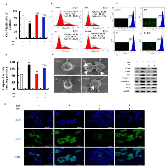 Effects of Iso (5 µM) on the pyroptotic hepatocyte damage induced by BaP (25 µM). Cell viability (A), cell cycle (B), ROS levels (C), and Caspase-1 enzyme activity (D) were detected. ** p < 0.01 compared with control, ## p < 0.01 compared with 25 µM BaP. Scanning electron microscope observation of membrane pores; white arrows indicate the membrane pore (E). Western blot image of protein expression acquired by Chemical XRS Imaging System (F). Nuclear translocation of phosphorylated p65 was observed by immunofluorescent labeling with DAPI (blue) and anti-phosphorylated p65 (green) (G).