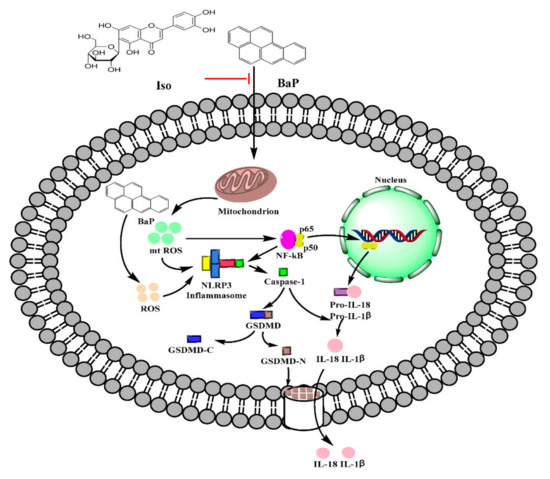 Pyroptosis is a programmed cell death mode which depends on the inflammatory Caspase family and is accompanied by an inflammatory reaction. Long-term and excessive pyroptosis will lead to cell death, tissue damage, organ failure, septic shock, and other pathological conditions []. It has been reported that Gossypol, Arsenic, and Cadmium induced the pyroptotic damage [,,]. Our preliminary study also demonstrates that BaP caused hepatocytes damage via inducing pyroptosis [,]. Iso is a natural flavonoid with a luteolin structure that is widespread in some foods and edible plants [,]. It could improve cell viability, reduce the electrical conductivity, NO release, and the protein expression of Caspase-1 to alleviate BaP-induced pyroptotic liver injury []. In this study, we further verified that Iso could reduce the membrane pores, the nuclear localization of the p65 subunit of NF-κΒ, the activation of NLRP3 inflammasome, the increase of Caspase-1 enzyme activity, and the characteristic protein expression of pyroptosis (Caspase-1, GSDMD-N, IL-1β, and IL-18), ultimately ameliorating BaP-induced pyroptotic damage by inhibiting the ROS/NF-κB/NLRP3/Caspase-1 signaling pathway in HL-7702 cells (Figure 8).