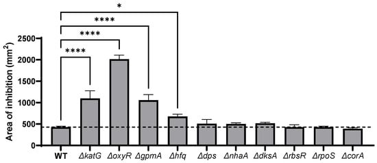 The deletion mutants of the other genes identified by TraDIS were also tested against these oxidants (Supplementary Materials Figure S1). The ΔdksA mutant was more sensitive to methylhydroquinone, cumene peroxide, diamide and ciprofloxacin, and the ΔnhaA mutant was slightly more sensitive to diamide and ciprofloxacin. This suggests that these mutants, despite no increased sensitivity to H2O2 in these conditions, were more sensitive to other oxidative stresses. Other mutants did not display significant differences compared to WT.