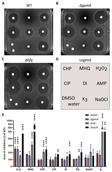 Single-deletion mutants were tested against other oxidants by disk diffusion assay (Figure 3). The deletion of oxyR and hfq led to an increase of the inhibition area of a wide range of oxidants (Figure 3C,E). The deletion of gpmA led to a hypersensitivity to H2O2 but not to other oxidants or antibiotics (Figure 3B,E). This pattern was highly similar to the sensitivity of the ΔkatG mutant used as positive control (Figure 2E).