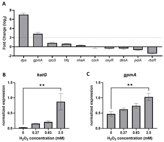 gpmA expression is upregulated following exposure to H2O2. (A) Differential expression of the 10 genes identified by TraDIS 10 min after exposition to 2.5 mM H2O2 compared to no treatment (mean +/− SD, N = 4). Data originated from previously performed RNA-seq (deposited on ENA with the accession number: PRJEB51098) []. (B,C) Levels of expression of katG and gpmA, respectively, in the strain MG1655 under increasing concentration of H2O2, assessed by qRT-PCR, ** corresponds to p < 0.01. (SEM +/− SD, N = 3).