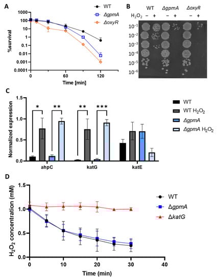3.3. ΔgpmA Mutant Was More Sensitive to H2O2 but Not to Other Oxidants