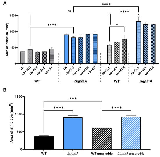 The difference in H2O2 tolerance between WT and ΔgpmA mutant is not affected by the addition of other carbon sources or the absence of oxygen. (A) Area of inhibition assessed by disk diffusion assay of WT and ΔgpmA strain on LB and M9 minimal medium complemented with diverse carbon source. GLU: glucose, GLY: glycerol, ACE: acetate, CIT: citrate (mean +/− SD, N = 3). (B) Area of inhibition of the WT and ΔgpmA strain under aerobic and anaerobic conditions (mean +/− SD, N = 3). Data in (A,B) were analyzed by one-way ANOVA with Tukey test for multiple comparison, and *, ***, **** correspond to p < 0.05, 0.001, 0.0001 respectively.