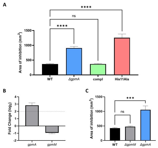 The function of gpmA, but not gpmM, is necessary to reach WT level of H2O2 tolerance. (A) Sensitivity to H2O2 assessed by disk diffusion assay for the WT with the empty plasmid, the ΔgpmA mutant with the empty plasmid, the ΔgpmA mutant with the plasmid encoding the native sequence of gpmA (compl) and the ΔgpmA mutant complemented with the plasmid encoding gpmA with the replacement of the histidine 11 by an alanine (His11Ala). All tests were performed in LB + ampicillin. Data were analyzed by one-way ANOVA with Tukey test for multiple comparison and **** correspond to p < 0.0001 (mean +/− SD, N = 3). (B) Differential expression of gpmA and gpmM 10 min after exposition to 2.5 mM H2O2 compared to no treatment (mean +/− SD, N = 4). Data from previously performed RNA-seq (deposited on ENA with the accession number: PRJEB51098) []. (C) Sensitivity to H2O2 assessed by disk diffusion assay of WT, ΔgpmA and ΔgpmM mutants. Data were analyzed by Welch t-test and *** correspond to p < 0.001 (mean +/− SD, N = 3).