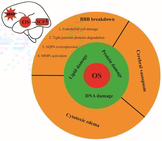Intracranial hypertension is a common complication of aSAH, which is also a critical determinator of the prognosis of patients with aSAH. Currently, there is evidence pointing to OS as a major contributor to increased ICP after aSAH. Importantly, impaired BBB is considered one of the most important causes of elevated ICP after aSAH. Specifically, OS can lead to the disruption of the BBB in several ways, including the apoptosis of the endothelial cells [,], damage to the tight-junction proteins [], the activation of matrix metalloproteinases [,], and the elevated levels of aquaporin-4 [] in patients with aSAH. Moreover, augmented levels of superoxide anions in the CSF after aSAH have been reported to display an association with cerebrovascular spasm, which may further lead to cerebral ischemia and elevated ICP [,]. OS-induced vasoconstriction is associated with NO depletion, the suppression of voltage-dependent K+ channels, and the upregulation of R-type Ca2+ channels in the cerebral arteries [,,,]. Moreover, OS-induced damage to the lipids, proteins, and DNA can lead to cytotoxic edema and the subsequent elevation of ICP as well (Figure 2).