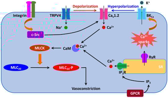 Vascular smooth muscle cells in resistance arteries/arterioles become depolarized in response to increased intraluminal pressure [,,]. Various mechanisms have been proposed to regulate myogenic tone (Figure 2). It is widely believed that pressure-induced membrane depolarization in vascular smooth muscle cells is instigated by mechanosensitive or stretch-activated cation channels including transient receptor potential (TRP) channels and epithelial Na+ channels (ENaCs) [,,,,,,]. The membrane depolarization leads to increased [Ca2+]i and vasoconstriction [,]. The increases in both [Ca2+]i and/or myogenic tone are blocked by the removal of extracellular Ca2+ or by Cav1.2 blockers [,,,,,,,]. These findings suggest that altered intraluminal pressure initiates myogenic tone via membrane depolarization and subsequent opening of Cav1.2. This notion is corroborated by findings from the genetic deletion of Cav1.2 α1c subunit in smooth muscle []. Such a manipulation abolishes myogenic reactivity in murine tibialis arteries []. However, Ca2+ influx mediated by T-type voltage-gated Ca2+ channels (Cav3.x) may also contribute to myogenic tone development [,]. Integrins, linking the extracellular matrix and cellular cytoskeleton, could also function as mechanotransducer to regulate myogenic tone via c-Src-mediated phosphorylation of Cav1.2 [,,]. Moreover, some G protein-coupled receptors are mechanosensitive and produce inositol triphosphate (IP3) upon stretch to induce Ca2+ release via activating IP3R on the sarcoplasmic reticulum (SR) membrane [,]. Over myogenic tone, extrinsic factors such as vasodilators and vasoconstrictors can induce vasodilation and further vasoconstriction, respectively. It should be noted that the large-conductance Ca2+-activated K+ channel is also activated by the increase in intralumenal pressure, which functions as a negative feedback mechanism to limit the magnitude of intralumenal pressure-induced vasoconstriction under physiological conditions []. For more detailed information on the regulation of myogenic tone by ion channels, readers are referred to recent reviews on this topic [,,]. As aforementioned, myogenic response is the intrinsic property of vascular smooth muscle cells to respond to changes in intraluminal vascular pressure. In general, myogenic tone development is independent of endothelium [,,]. However, myogenic tone can be modified by the endothelium. For example, activation of the endothelial intermediate-conductance Ca2+-activated K+ channel is found to reduce myogenic tone [,]. Moreover, myogenic tone in mouse mesenteric and uterine arteries from pregnant mice is enhanced by the loss of endothelium-derived NO [].