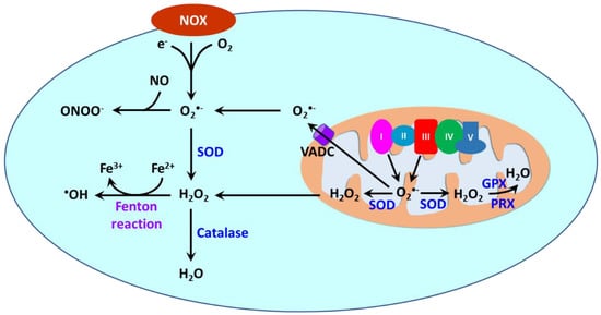ROS generation by NOXs and mitochondria and detoxification. In vascular smooth muscle cells, ROS is primarily produced by NOXs and mitochondria. NOXs catalyze the production of O2•− by transferring one electron to O2 from NADPH. In mitochondria, O2•− is also produced from leaked electrons by Complexes I and III in the electronic transfer chain (ETC) during the electronic transfer. O2•− is dismutated to H2O2 by superoxide dismutase (SOD). H2O2 is subsequently decomposed to H2O by catalase, glutathione peroxidase (GPX) and peroxiredoxin (PRX). O2•− can be released into the cytosol from mitochondria via the voltage-dependent anion channel (VADC) on the mitochondrial outer membrane, whereas H2O2 in mitochondria can be transported to the cytosol via diffusion or via aquaporins. O2•− reacts with nitro oxide (NO) to produce peroxynitrite (ONOO−), whereas H2O2 reacts with Fe2+ via the Fenton reaction to yield •OH.