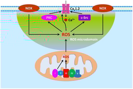 ROS generated in different cellular compartments form microdomains and act on their targets in a spatiotemporal manner [] (Figure 4). The redox regulation of Cav1.2 requires adjacent location of mitochondria and NOXs to Cav1.2 on the plasma membrane in vascular smooth muscle cells [,]. Thus, it is expected that microdomains with high concentrations of ROS exist in subcellular regions next to Cav1.2. Interestingly, redox modulation of Cav1.2 can occur directly or indirectly. In addition to directly targeting Cav1.2, ROS could oxidize partners of Cav1.2 to indirectly alter Cav1.2 activity. As aforementioned, PKC and c-Src form a partnership with Cav1.2 to regulate the activity of the channel. PKC contains six cysteine residues in each of the two pairs of zinc fingers within the regulatory domain and the oxidation of them activates PKCs [,]. H2O2 has been shown to activate PKCs in vascular smooth muscle cells [,]. SH2 domain of c-Src also contains cysteine residues and oxidation of these residues promotes the formation of disulfide bridges that subsequently override the autoinhibitory effect of Tyr527, leading to enzymatic activation []. Vascular c-Src is activated by NOX4- and mitochondria-derived ROS [,]. ROS produced by both NOXs and mitochondria are found to activate adjoining PKCs, which in turn enhances Cav1.2 activity in vascular smooth muscle cells [,,]. Not surprisingly, H2O2-induced vasocontraction is reduced by PKC/c-Src inhibition and by Cav1.2 blockade [,,,,]. Similarly, the potentiation of KCl-induced vasoconstriction of rat mesenteric and intrapulmonary arteries by NOX-derived ROS is also sensitive to the inhibition of PKC/c-Src []. Calmodulin is a key Ca2+ sensor for both Cav1.2 inactivation and facilitation []. Modulation of calmodulin by H2O2 also augments cardiac Cav1.2 activity [].
