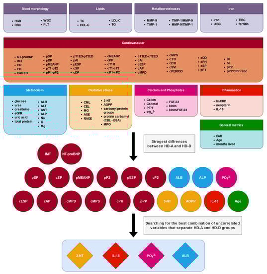 Stages of variable selection for the creation of the final model. We have distinguished 10 categories of variables: blood morphology, lipids, metalloproteinases, iron, cardiovascular, metabolism, oxidative stress, calcium and phosphates, inflammation, and general metrics. Four categories ware completely rejected based on the Kruskal–Wallis test results. Spearman correlation and experimental model fitting helped to find the best combination of variables that differentiate the HD-A and HD-D groups (4 out of 21).