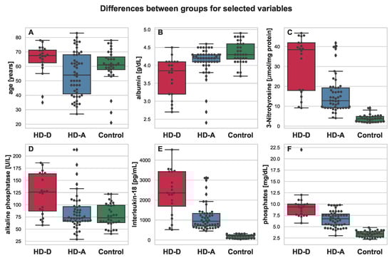 Boxplot depicting differences between HD-D (red), HD-A (blue), and Control (green) for the chosen variables: age (A), albumin (B), 3-Nitrotyrosine (C), alkaline phosphatase (D), Interleukin-18 (E), and phosphates (F). Additional swarmplot was overlaid onto the original plot in order to mark the obtained measurements for each of the patients (dots). Outlier values are represented by diamons.