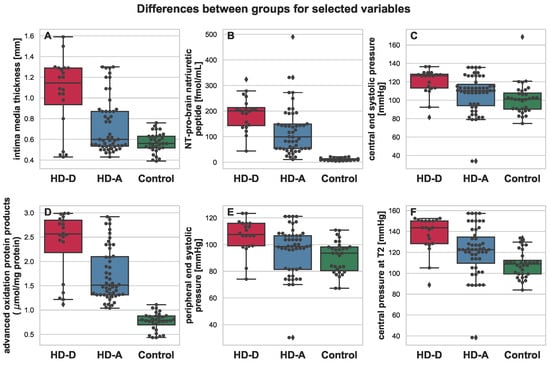 Boxplot depicting differences between HD-D (red), HD-A (blue), and Control (green) for the chosen variables: intima media thickness (A), NT-pro-brain natriuretic peptide (B), central end systolic pressure (C), advanced oxidation protein products (D), peripheral end systolic pressure (E), and central pressure at T2 (F). Additional swarmplot was overlaid onto the original plot in order to mark the obtained measurements for each of the patients (dots). Outlier values are represented by diamons.