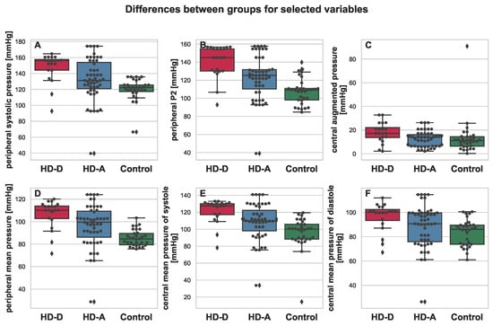 Boxplot depicting differences between HD-D (red), HD-A (blue), and Control (green) for the chosen variables: peripheral systolic pressure (A), peripheral P2 (B), central augmented pressure (C), peripheral mean pressure (D), central mean pressure of systole (E), and central mean pressure of diastole (F). Additional swarmplot was overlaid onto the original plot in order to mark the obtained measurements for each of the patients (dots). Outlier values are represented by diamons.