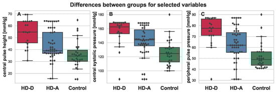 Boxplot depicting differences between HD-D (red), HD-A (blue), and Control (green) for the chosen variables: central pulse height (A), central systolic pressure (B), and peripheral pulse pressure (C). Additional swarmplot was overlaid onto the original plot in order to mark the obtained measurements for each of the patients (dots). Outlier values are represented by diamons.