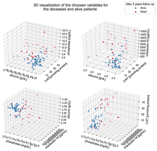 The strongest and most significant differences have been found for albumin, 3-NT, IL-18, AOPP, NT-proBNP, and phosphates, which may suggest the importance of kidney failure-associated factors such us inflammation, malnutrition, and nitrosative and oxidative stress.
