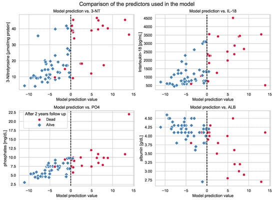 The correlation between variables selected in the previous step helps to evaluate them as potential death predictors, especially if taken in mutual complementation (see Table S1 and Figure S1 in Supplementary Materials). All chosen cardiovascular parameters were highly correlated, which was anticipated. In addition, only two other significant correlations were found, i.e., 3-NT with AOPP and pP2 with IL-18.