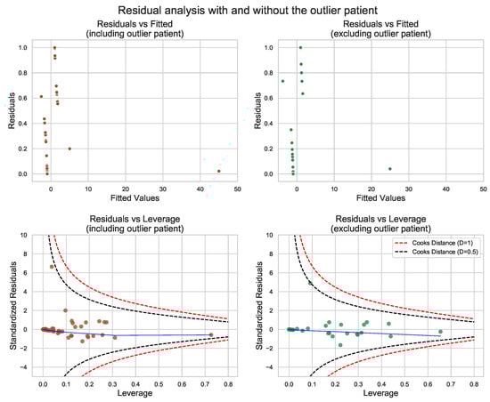 Residual diagnostic plots for the models with and without the outlier patient. Outliers can be spotted as outfits in residual vs. fitted plots. The significance of outliers can be analyzed by residuals vs. leverage plots. Sole observations at the end of the blue line may have a significant impact on the model if they cross the dashed lines drawn for Cook’s distance. In the presented case, the outlier has not fallen outside the Cook’s boundaries, and as it is presented in the subplots on the right, its deletion does not change the model in any significant manner.