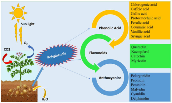 Potato polyphenols have gained most of the attention of nutritionists due to their excellent therapeutic and nutritional properties. Potato with colored flesh is a good source of polyphenols which helps in the reduction of various diseases, like cardiovascular diseases, cancer, etc. [,]. Potato polyphenols consist of phenolic acids, flavonoids, and anthocyanins. The major phenolic acids reported in potatoes are chlorogenic acid, caffeic acid, ferulic acid, syringic acid, gallic acid, protocatechuic acid, coumaric acid, and vanillic acid; the main flavonoids include kaempferol, quercetin, catechin, and myricetin, while the major anthocyanins are pelargonidin, peonidin, petunidin, malvidin, cyanidin, and delphinidin (Figure 1). The content of phenolic compounds varied significantly depending on the genotype [,], the location, and the color of the parenchyma. Polyphenol content in the purple potato cultivar were detected as 209 mg gallic acid equivalent (GAE)/100 g fresh weight (FW) []. In a whole potato tuber, the polyphenols ranged from 22.53 to 85.85 mg GAE/100 g FW, while in the flesh it was 20.26 to 63.05 mg GAE/100 g FW []. In purple potatoes, the polyphenols ranged from 162.19 to 510.20 mg GAE/100 g dry weight (DW), in red potatoes from 152.40 to 261.49 mg GAE/100 g DW, while in yellow potatoes ranged from 113.37 to 114.63 mg GAE/100 g DW among 20 Andean potato cultivars [].