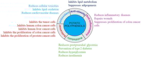 Dietary compounds in potatoes such as polyphenols and anthocyanins are known as major contributors to the health benefits []. Polyphenols are considered to be health-promoting phytochemicals as they have shown in vitro antioxidant activity and have been reported to exhibit beneficial anti-bacterial, hypoglycemic, anti-viral, anti-carcinogenic, anti-inflammatory, and vasodilatory properties []. This section briefly describes the health properties, especially antioxidant properties, anti-obesity, anti-diabetic properties, anti-inflammatory properties, and anticarcinogenic properties, associated with polyphenols and other bioactive compounds present in potatoes (Table 3; Figure 2). All these beneficial health-promoting properties of potatoes play a significant role against some chronic diseases like cancer, type 2 diabetes mellitus, obesity, and heart diseases.