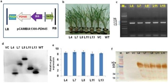 Screening and analysis of PDH45 marker-free transgenic lines. (a) T-DNA construct of pCAMBIA 1300-PDH45. (b) Transgenic lines (L4, L7, L8, L11, L13, VC, and WT). (c) PCR conformation of the PDH45-overexpressing transgenic (T1) lines showed the amplification of 1.2 Kb fragment. (d) Southern blot analysis showing the integration and copy number of the PDH45 gene. (e) Relative gene expression of PDH45 transgenic lines. (f) Western blot analysis showing the PDH45 protein (≈45 kDa).