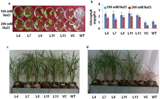 The damage caused in the leaf pieces by salt stress was observed in all the plants after 72 h; however, the PDH45-overexpressing lines displayed darker green leaves, in contrast to the yellowish leaves of the WT and VC plants (Figure 2a). In this sense, the reduction of chlorophyll content in leaf tissues was lesser in transgenic lines as compared to WT and VC plants under salt stress (Figure 2b). The lesser chlorophyll content in the leaf tissues of WT and VC plants as compared to transgenic lines provided strong evidence towards tolerance against salinity stress (Figure 2a,b). The transgenic lines (L4, L7, L8, L11 and L13) along with WT and VC plants were allowed to grow up to maturity in a metal tank filled with 200 mM NaCl. After 3d, WT and VC plants showed dropping characteristics, whereas PDH45-overexpressing transgenic lines L4, L7, L8, L11 and L13 grew well and produced viable seeds (Figure 2c,d).