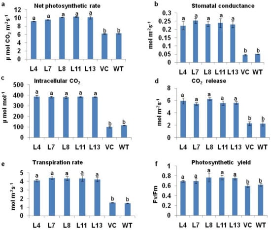 The photosynthetic characteristics of transgenic plants were observed and compared to WT and VC plants after 12 d of induction of 200 mM NaCl salt treatment. The photosynthetic rate declined by 33% in WT and 35% in VC plants as compared to PDH45 marker-free transgenic lines. The net photosynthetic rate, stomatal conductance, intracellular CO2, CO2 release, and transpiration rate were also higher in transgenic lines as compared to the WT and VC plants (Figure 3a–e).
