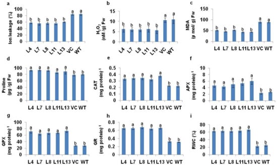 The salt-induced changes in the ion leakage, H2O2, proline content, accumulation of MDA, RWC, and antioxidant machineries in T1 PDH45 transgenic lines (L4, L7, L8, L11 and L13) were compared with WT and VC rice seedlings. We observed reduced levels of MDA, H2O2, and ion leakage, alongside an increase in proline content in PDH45 transgenic lines in comparison to the WT and VC plants under salt stress at 200 mM NaCl (Figure 4a–d). The activities of CAT, APX, GPX, GR and RWC were increased in PDH45 transgenic plants as compared to WT and VC plants (Figure 4e–i).