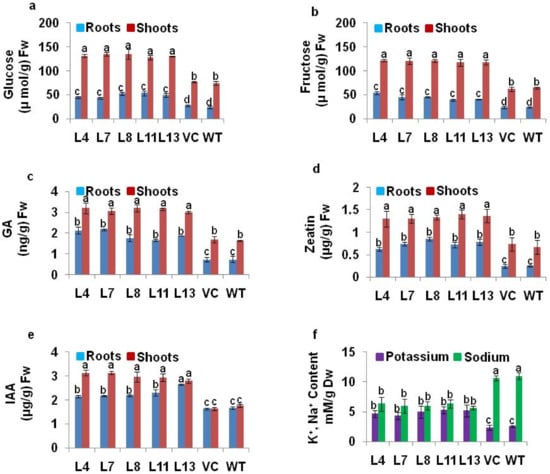The PDH45 L4, L7, L8, L11 and L13 transgenic lines showed higher endogenous sugar (glucose and fructose) content in roots as well as in shoots when compared with WT and VC plants (Figure 5a,b). The endogenous hormones such as GA, zeatin, and IAA content were also higher in roots and shoots of PDH45 transgenics as compared to WT and VC plants (Figure 5c–e). The potassium content in transgenic plants was higher, whereas sodium content was lower in marker-free PDH45 transgenic plant tissues as compared to WT and VC plants (Figure 5f).
