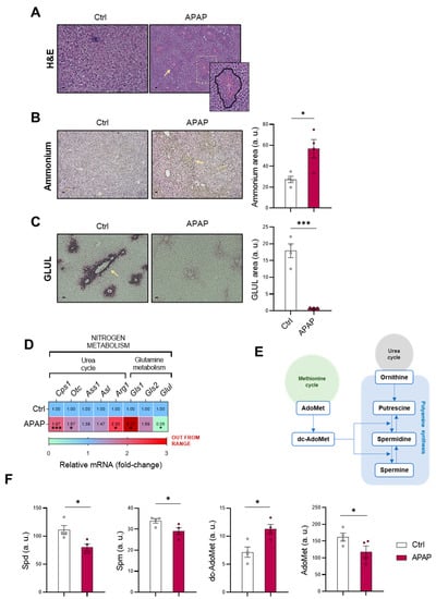 Ammonia homeostasis, methionine cycle and polyamine synthesis are altered in DILI. (A) Hepatic hematoxylin and eosin (H&E) staining (zoom-in); representative micrographs and respective quantification of (B) ammonia and (C) glutamine synthetase (GLUL) staining (highlighted with yellow arrows); (D) relative mRNA expression of the urea cycle and glutamine metabolism genes and (F) determination of spermidine (Spd), spermine (Spm), decarboxy-S-adenosylmethionine (dc-AdoMet) and S-adenosylmethionine (AdoMet) in liver from mice treated with 360 mg/kg acetaminophen (APAP) compared to healthy controls. (E) Schematic representation of interconnection among the methionine and urea cycles and polyamine synthesis. Scale bar corresponds to 50 μm. * p < 0.05 and *** p < 0.001 are shown.