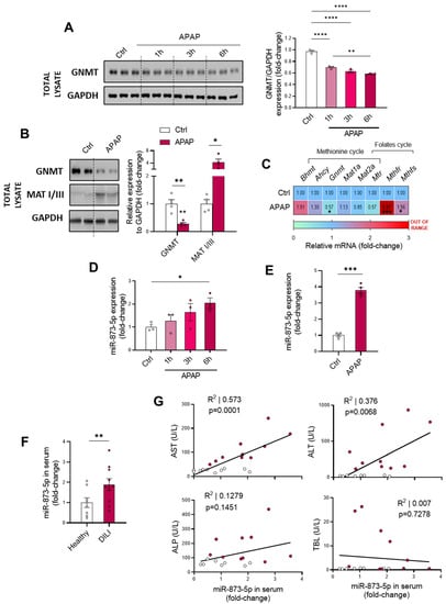 Glycine-N-methyltransferase (GNMT) expression is decreased in DILI by the enhanced expression of miR-873-5p. (A) Western blot of GNMT, loading control and respective quantification in primary hepatocytes cultured for 1, 3 and 6 h with 10 mM acetaminophen (APAP); (B) Western blot of GNMT and Methionine adenosyltransferase I/III (MATI/III) and relative expression of (C) mRNA from methionine and folates cycles enzymes in liver from mice administered 360 mg/kg APAP for 48 h. miR-873-5p expression in (D) primary hepatocytes cultured for 1, 3 and 6 h with APAP, (E) Liver from mice administered 360 mg/kg APAP for 48 h and (F) serum from drug-induced liver injury patients (DILI) compared to a control group or healthy individuals. (G) Correlation between levels in serum of miR-873-5p and aspartate aminotransferase (AST), alanine. aminotransferase (ALT), alkaline phosphatase (ALP) and total bilirubin (TBL) from DILI patients compared to healthy individuals. * p < 0.05, ** p < 0.01, *** p < 0.001 and **** p < 0.0001 are shown.