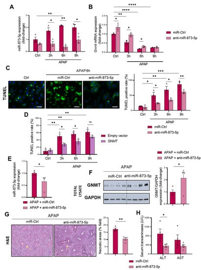 miR-873-5p contribution to DILI-induced GNMT downregulation was further addressed in vitro in primary wild-type hepatocytes by an anti-miR therapy, which effectively decreased the expression of the miRNA (Figure 3A). Subsequently, the loss of Gnmt mRNA (Figure 3B) and protein expression (Figure S1A,B) was partially prevented by the anti-miR-873-5p, thus leading to decreased APAP-induced cell death, measured by TUNEL at different times of 3, 6 and 9 h (Figure 3C) and Trypan Blue at 6 h (Figure S1C). Remarkably, anti-miR-873-5p prevented the GNMT loss at both cytoplasmic and nuclear levels (Figure S1B). Otherwise, the miR-873-5p enhanced expression by a mimic-miRNA further aggravated hepatotoxicity, as shown in Figure S1D, while GNMT overexpression by a transient transfection of wild-type primary hepatocytes also led to protection against APAP at 3 and 6 h but not as much as at 9 h (Figure 3D and Figure S2A,B). The relevance of GNMT expression in APAP hepatotoxicity and the protective effect exerted by the anti-miR was further determined in primary hepatocytes lacking Gnmt, where, although miR-873-5p was inhibited (Figure S2C), no protection was observed (Figure S2D).
