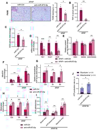 The present results suggest that inhibition of miR-873-5p reduces the inflammatory response under APAP both in vivo and in vitro, restores GSH levels and improves mitochondrial functionality, thereby reducing the overproduction of ROS.