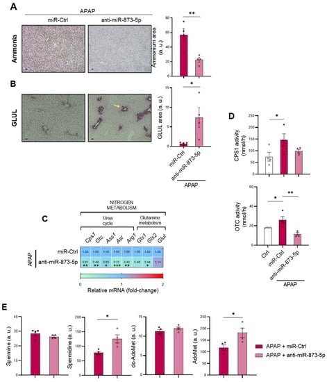 Taken together, these results present the interconnection between ammonia homeostasis and the methionine cycle and enhanced polyamine synthesis, responsible for preventing hepatotoxicity by inhibiting miR-873-5p expression.