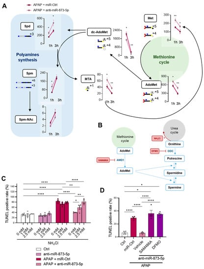 Methionine cycle recovery rewires nitrogen homeostasis from urea cycle to polyamine synthesis. (A) Schematic representation and determination of metabolites from methionine metabolism and polyamine synthesis in primary hepatocytes treated with 13C–methionine and 10 mM acetaminophen (APAP) at different times (1 and 3 h) and an anti-miR-873-5p or an unrelated control (miR-Ctrl): methionine (Met), S-adenosylmethionine (AdoMet), decarboxy-S-adenosylmethionine (dc-AdoMet), MTA, spermidine (Spd), spermine (Spm) and N-acetylspermine (Spm-NAc). (B) Schematic representation of TUNEL determination of primary hepatocytes treated for 6 h with 10mM APAP, an anti-miR-873-5p or miR-Ctrl and (C) different concentrations of ammonium chloride (1 mM and 2.5 mM NH4Cl) or (D) 1 μM SAM486A or 0.5 μM DFMO. * p < 0.05, ** p < 0.01, **** p < 0.0001 are shown.