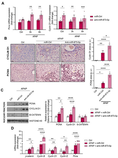 Finally, the hepatic proliferative response was evaluated, considering: (i) the increased ATP levels in primary hepatocytes when targeting miR-873-5p (Figure 4I), essential for liver regeneration after an injury [,] and (ii) the role of polyamines in cell regeneration []. The in vitro mRNA determination of the proliferation markers Proliferating cell nuclear antigen (Pcna) and Cyclin D1 showed an increased expression under miR-873-5p inhibition (Figure 7A). Likewise, the hepatic PCNA and cyclin D1 expression at protein levels showed an increase under APAP stimulation, attempting to compensate for the hepatotoxic damage, which is further enhanced by the anti-miR-873-5p treatment (Figure 7B). The nuclear amount of these markers, together with β-catenin, also increased in the liver from anti-miR-treated mice (Figure 7C). Finally, the hepatic mRNA expression of proliferative markers such as β-catenin, Pcna or Cyclin B, D1 and E also suggested an increased proliferative response in treated mice (Figure 7D).
