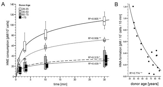 Age dependence of HNE metabolism in cultured human skin fibroblasts. Cell cultures were established from donors of different ages and treated with 1 µM HNE. (A) HNE consumption curves (expressed as pM HNE per 103 cells) determined 1, 3, 10 and 30 min after HNE addition. Data of the age cohorts are presented as Box-Whisker Plots. (B) Formation of hydroxynoneoic-acid (HNA) from HNE in the fibroblast cultures expressed as pM HNA/103 cells/10 min). * p < 0.05; ** p < 0.005 significance of the correlation (Pearson): [Siems W., Voss P., Bresgen N., Eckl P. and Grune T., unpublished data] [].