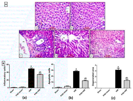 Rat liver sections of sham and paeonol + sham groups revealed the same normal lobular architecture with normal central veins lined by flatted endothelial cells (Figure 2(Aa,Ab)). These veins were surrounded by numerous cords of polygonal hepatocytes that appeared with granular cytoplasm and central, rounded, vesicular nuclei. Some cells appeared binucleated. The blood sinusoids were lined by Kupffer cells. In contrast, the HIR group displayed disturbed lobular architecture with dilated both central and portal veins. In addition, the sections showed dilated portal arteries and portal veins with nearby cellular infiltrations and hemorrhage. Cells had darkly stained nuclei with deeply stained cytoplasm. Wide blood sinusoids were seen between the hepatocytic cells (Figure 2(Ac,Ad)). Meanwhile, the paeonol + HIR group displayed normal lobular architecture with apparent normal central veins except for focal dilated blood sinusoids. Hepatocytes appeared polygonal with acidophilic cytoplasm and vesicular nuclei nearly similar to the control. In addition, hepatic cytoplasmic vacuolations were seen among the sections (Figure 2(Ae)). The HIR group displayed a significant increase in the number of inflammatory and apoptotic cells, as well as the degenerated areas within the hepatic lobules compared to the sham-operated control group. At the same time, the administration of paeonol significantly mitigated these alternations compared to the HIR group (Figure 2(Ba–Bc)).