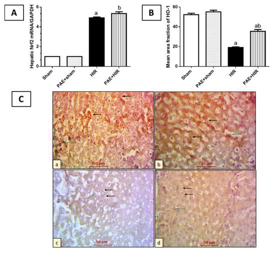Effect of paeonol (PAE) on the nuclear factor erythroid-2-related factor 2 (Nrf2)/heme-oxygenase-1 (HO-1) pathway in rats’ hepatic ischemia/reperfusion (HIR) injury. (A) Relative expression level of the hepatic Nrf2 using real-time polymerase chain reaction. (B) Semi-quantification of the hepatic HO-1 expression. (C) Photomicrographs of rat liver sections immunohistochemically stained for detection of HO-1 (×400). (Ca,Cb) Sham and PAE + sham groups show strong, widespread cytoplasmic expression of HO-1 in both hepatocytes (black arrows) and Kupffer cells (green arrows). (Cc) The HIR group shows hepatocytes (black arrows) and Kupffer cells (green arrows) with minimal HO-1 cytoplasmic expression. (Cd) The PAE + HIR group shows hepatocytes (black arrows) and Kupffer cells (green arrow) with moderate HO-1 cytoplasmic expression. Each value represents the mean ± SEM (n = 7). a Significant difference from the sham-operated control group and b significant difference from the HIR group, respectively, at p ˂ 0.05.