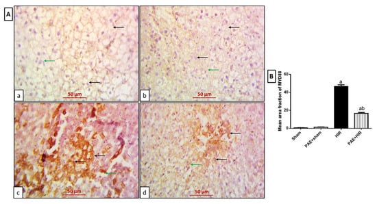 Further, in the immunohistochemical study for MYD88 (Figure 6A,B), sham and PAE + sham groups displayed hepatocytes and Kupffer cells with negative expression (Figure 6(Aa,Ab)). However, the HIR group showed more cytoplasmic expression in hepatocytes and Kupffer cells compared to the sham-operated control group (Figure 6(Ac)). In addition, less expression in both hepatocytes and Kupffer cells was observed in the HIR group treated with paeonol compared to the HIR untreated group (Figure 6(Ad)).