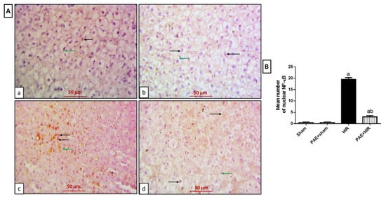 Effect of paeonol (PAE) on toll-like receptor 4 (TLR4) in rats’ hepatic ischemia/reperfusion (HIR) injury. (A) Photomicrographs of rat liver sections stained for detection of TLR4 (×400). (Aa,Ab) Sham and PAE + sham groups show negative expression of TLR4 in both hepatocytes (black arrows) and Kupffer cells (green arrows). (Ac) The HIR group shows hepatocytes (black arrows) and Kupffer cells (green arrow) with extensive TLR4 cytoplasmic expression. (Ad) The PAE + HIR group shows hepatocytes (black arrows) and Kupffer cells (green arrow) with minimal TLR4 cytoplasmic expression. (B) Semi-quantification of the hepatic TLR4 expression. Each value represents the mean ± SEM (n = 7). a Significant difference from the sham-operated control group and b significant difference from the HIR group, respectively, at p < 0.05.