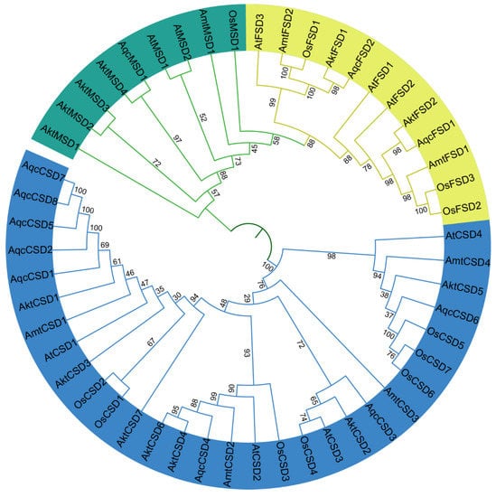 SOD protein sequences of Amborella trichopoda (basal angiosperm), Aquilegia coerulea (basal dicot), Arabidopsis thaliana (core dicot), and Oryza sativa (monocotyledon) were identified in the same way as those of A. trifoliata. The protein sequences of A. trichopoda and A. coerulea were downloaded from NCBI; those of A. thaliana and O. sativa were downloaded from Ensembl Plants (http://plants.ensembl.org/index.html, accessed on 6 January 2023). The evolutionary relationship was constructed using IQtree with 1000 bootstrap replicates [], and the online tool iTOL (https://itol.embl.de/, accessed on 15 January 2023) was used for subsequent visualization [].