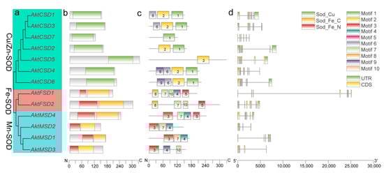 Gene and protein structure analyses of AktSOD families. (a) Phylogenetic tree of AktSOD genes. (b) Conserved domains of AktSOD proteins. (c) Motifs of AktSOD proteins. (d) Exon–intron structures of AktSOD genes.