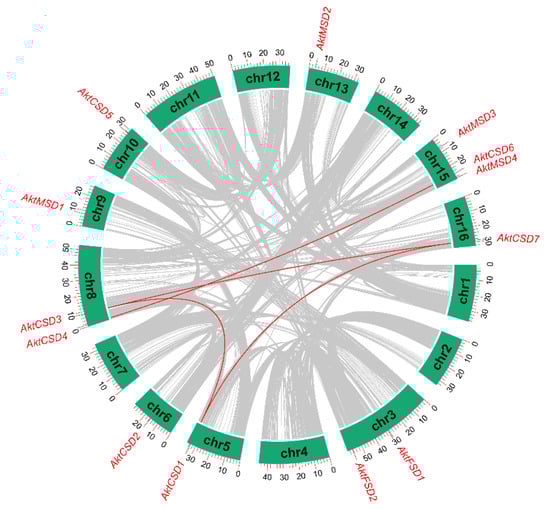 Chromosomal localization and interchromosomal synteny of AktSODs. Red lines in the inner circle represent syntenic gene pairs from WGD/fragment duplications.