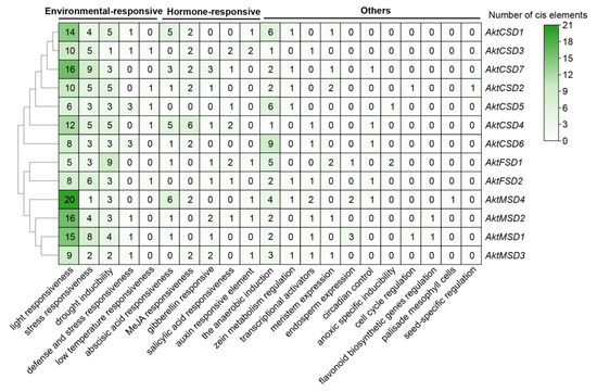 Statistical results for putative cis-acting elements showed a large number of environmental and hormone-responsive elements to be distributed throughout the promoter region of AktSODs (Figure 4; Table S3). All AktSODs contain at least one light-responsive, stress-responsive and drought-inducible element. The number of light-responsive elements is greatest; AktFSD1 has the lowest number, at 5; AktMSD4 has the highest number, at 20. In addition, 5 plant hormone-responsive elements, including for abscisic acid (ABA), methyl jasmonate (MeJA), gibberellin (GA), salicylic acid (SA) and auxin, were detected in the promoter region of AktSODs, with the distribution varying. For example, AkCSD5 has only one hormone-responsive element, namely, the TCA element, which is annotated as responsive to salicylic acid (Table S3). AkCSD4, AkCSD7, AkFSD1, and AkMSD2 contain four types of hormone-responsive elements.