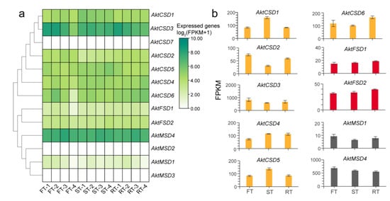 Expression levels of 13 AktSODs in different tissues and developmental stages (FT: flesh, ST: seed, RT: rind, 1: young stage, 2: enlargement stage, 3: coloring stage, 4: mature stage). (a) Heatmap of expression of 13 AktSODs in three fruit tissues at four stages. (b) Total expression of AktSODs in three fruit tissues contains the total FPKM of each fruit tissue in its four development stages. The error bars of the column represent the standard deviation of FPKM in the four development stages. The different colors of the column represent three subfamilies of AktSODs.
